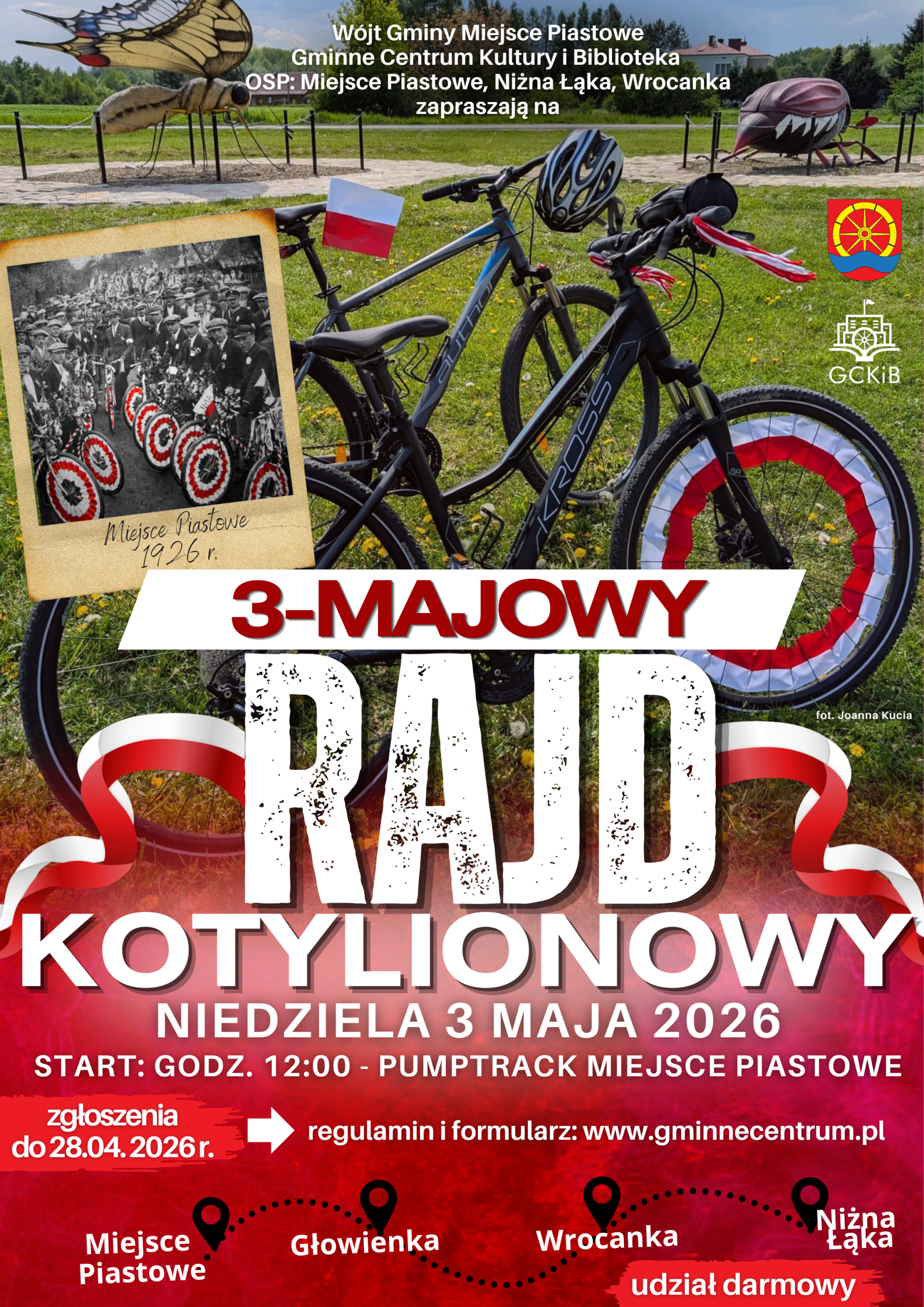 Zapraszamy do udziału w 3 Majowym Rodzinnym Rowerowym Rajdzie Kotylionowym, który odbędzie się 3 maja 2026 roku w Miejscu Piastowym. Tegoroczna edycja będzie szczególnym wydarzeniem upamiętniającym rocznicę uchwalenia Konstytucji 3 Maja oraz pięknym nawiązaniem do 100. rocznicy obchodów tego święta, jakie miały miejsce w 1926 roku w Miejscu Piastowym.